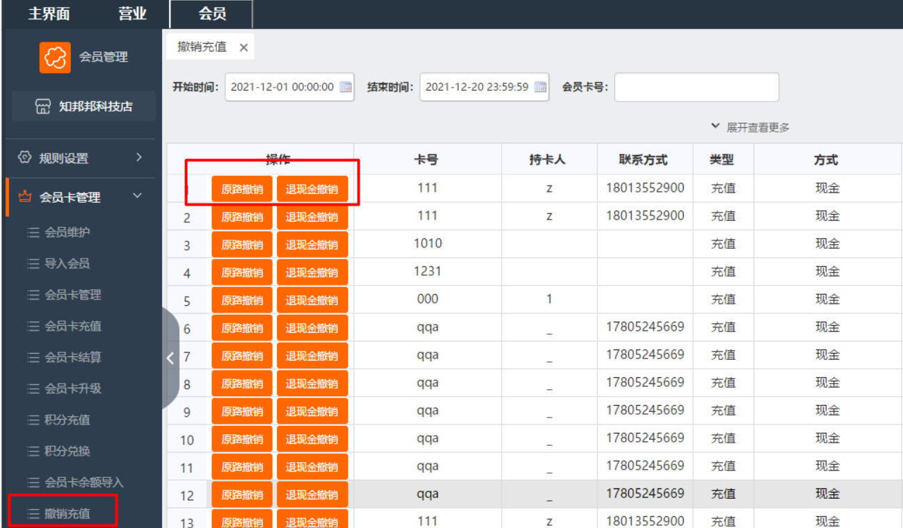 会员模块-会员卡管理-撤销充值,可看到充值记录