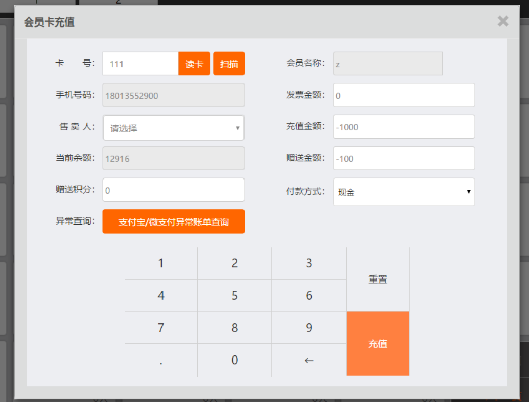 会员卡余额区分充值余额和赠送余额,负充值时应对应,需减少充值余额则在充值金额中输入负数,需减少赠送余额时则在赠送金额中输入负数。